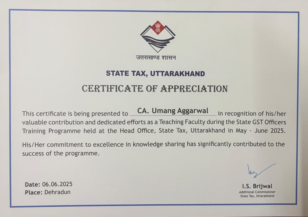 Certificate of appreciation for conducting a training session for state GST officers of Uttarakhand